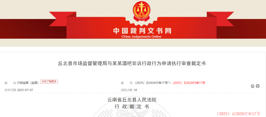 丘北县市场监督管理局与某某酒吧非诉行政行为申请执行审查裁定书